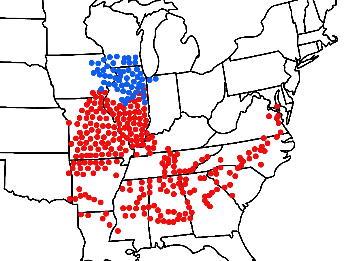 Map of where Broods XIII (blue) and XIX (red) occur. Map provided by Gene Kritsky, Mount St. Joseph University.