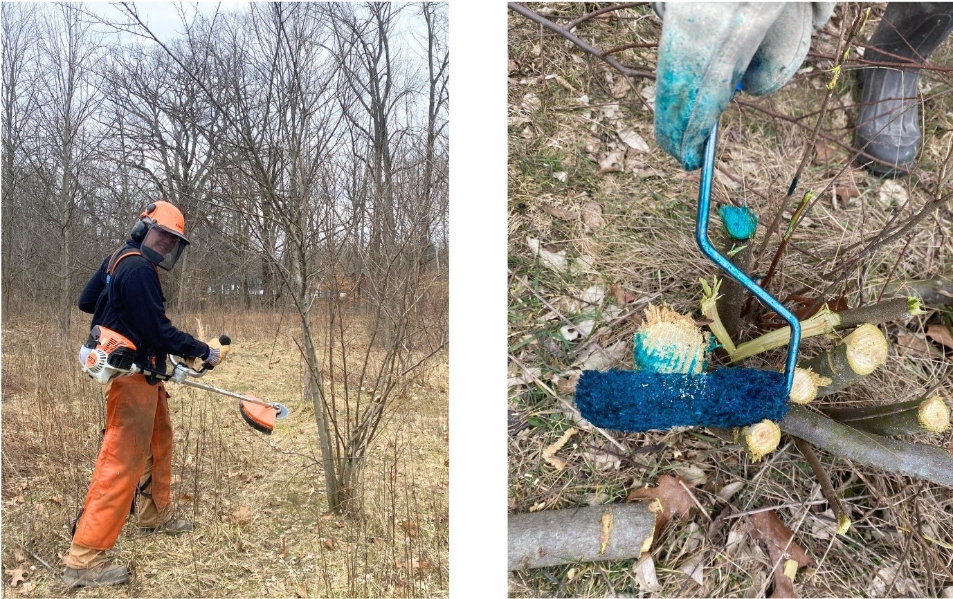 Left image- Alex, COL's Stewardship Field Supervisor, wielding the brush cutter. Right image- Applying herbicide to a fresh-cut stump. You can see why we wear gloves!