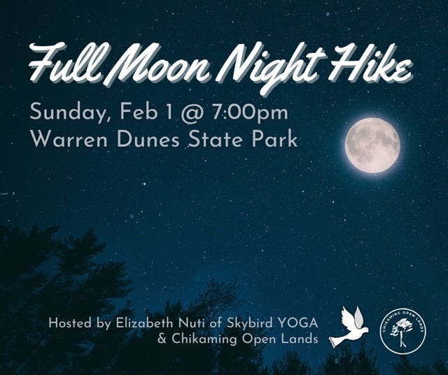 Join us for a winter full-moon hike at Warren Dunes State Park! Winter nighttime hikes are truly magical. We’ll hike up the dune, spend time in quiet-listening, and experience the dunes by moonlight. With luck, owls may be out. Plan to be there about 1 hour (a little more or less depending on the weather).